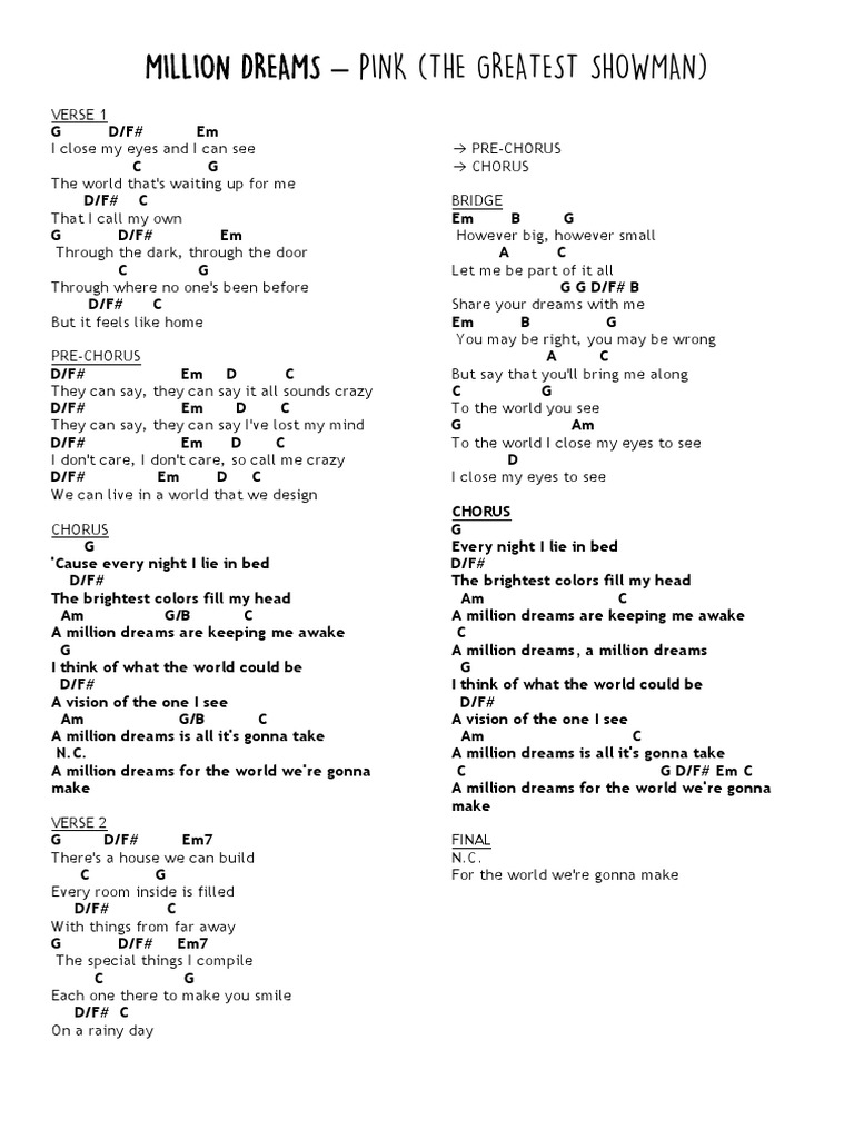 Welcome to my a million dreams chord chart by pink from the movie the greatest showman. Get dj recommendations for harmonic mixing. The special things i compile. A vision of the one i see. Each one there to make you smile.